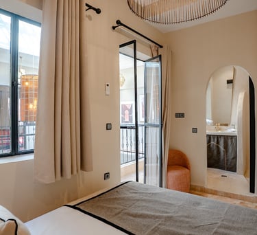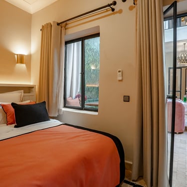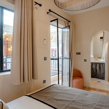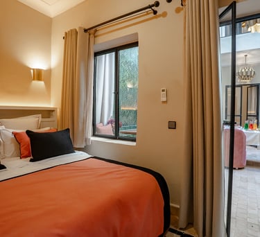 A serene retreat with views of the lush courtyard and calming sage-green accents.